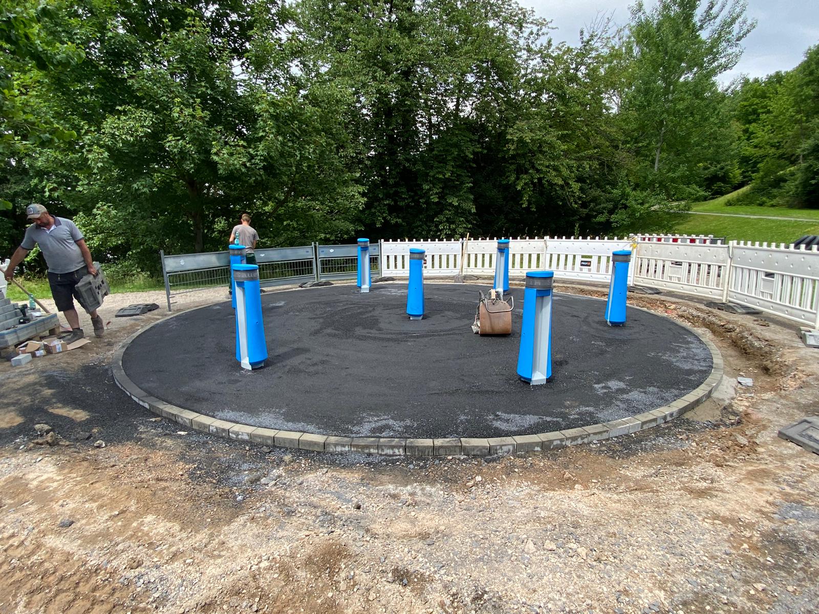 Wegen fehlenden Schattens waren die Lichtsignale, die die einzelnen Spielvarianten steuern, für die Kinder schwer zu erkennen. Zum anderen sorgte die Sonne dafür, dass an den heißen Tagen der Schweiß im Übermaß geflossen ist. Die Fachleute hatten schnell eine Lösung parat: Die Installation eines Sonnensegels. Doch der Teufel steckte in diesem Fall nicht im Detail, sondern in Form von massivem Kalkfelsen im Boden.
