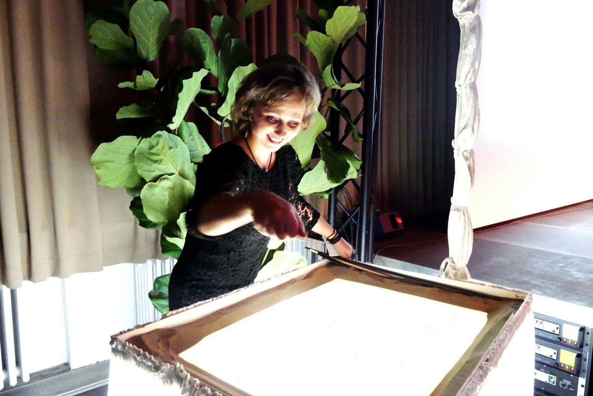 Es gab einen Augenblick, der magisch war, wo im Saal alle den Atem anzuhalten schienen. Mit Iryna Bilanka-Chaplin hatte der Förderverein ein Sahnebonbon in petto. Die preisgekrönte Künstlerin ist in Kiew geboren, lebt aber in Wetzlar und liebt die Sandmalerei: Unter dem Titel Nicht auf Sand gebaut zeichnete die Künstlerin die Geschichte der Landesgartenschau und des Sauerlandparks nach. Während Iryna Bilanka-Chaplin mit dem Sand zu spielen schien, wurde das Ganze an die Leinwand projiziert. Mit Musik untermalt erzählte sie malend ihre Geschichte – emotional und mitreißend. Sie malte nicht nur das Felsenmeer, sondern setzte auch die Stadt Hemer, die Landesgartenschau und den Förderverein Sauerlandpark ins rechte Licht – und das alles mit einer Leichtigkeit, die sprachlos machte.
