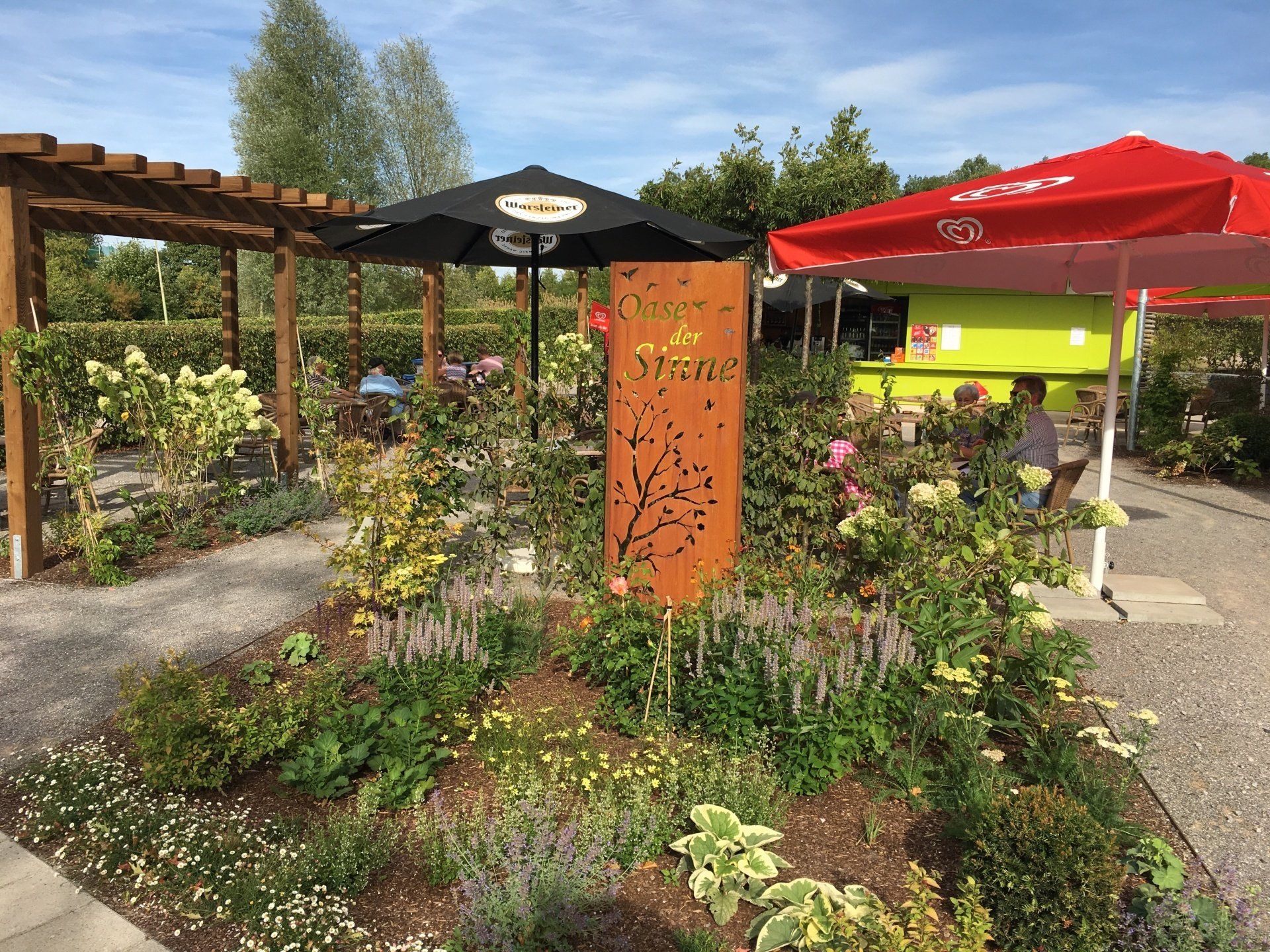 Oase der Sinne als gemütlicher Treffpunkt in direkter Nähe zum Labyrinth, Englischen Gartenzimmer, Senkgarten, Bürgerstauden- sowie Felsengarten ist immer ein Besuch wert.