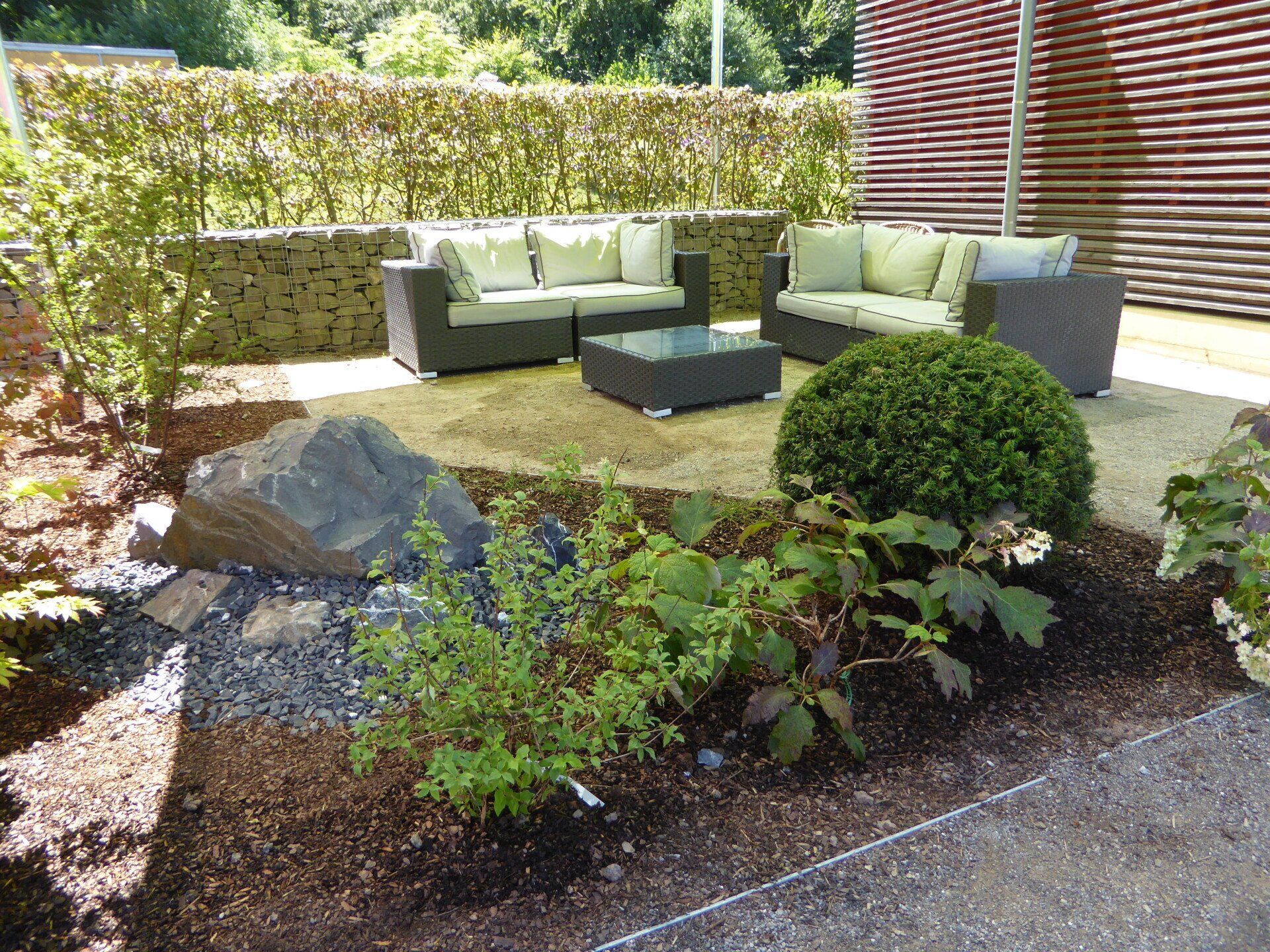 Die verbleibende Fläche wird mittig durch eine Buchenhecke geteilt, in die drei Bäume gepflanzt werden. Links von der Hecke werden vier Querriegel gesetzt, ebenfalls aus Buchenhecke, die dann drei Sitznischen ergeben. Die Hecke wird nur so hoch sein, dass man im Sitzen darüber hinwegschauen kann. Vor der rechten Seite der Hecke ist keine Bepflanzung vorgesehen, so dass man bei größeren Events die Möglichkeit hat, zusätzliche Tische und Stühle zu stellen. Die Längsseite des Pfadfinderpavillons bekommt ein Pflanzbeet mit unterschiedlichen Gräsern; und auf der Rückseite werden wir einen gemütlichen Sitzplatz aus wetterfesten Lounge-Möbeln einrichten.