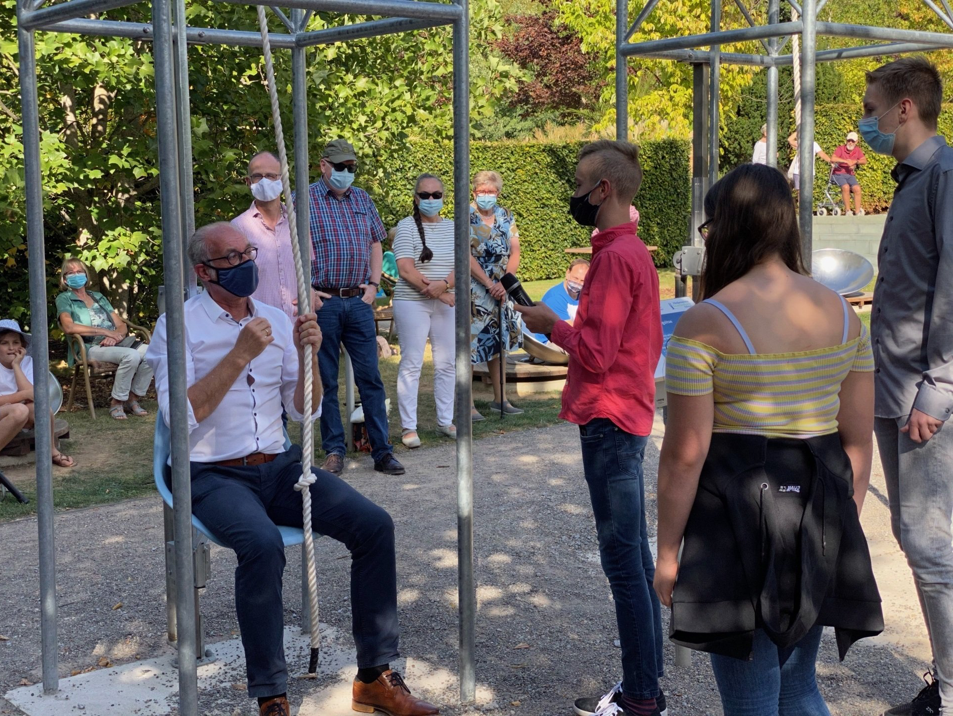 Ist möglich, sich am eigenen Zopf aus dem Sumpf zu ziehen, wie es der vor rund 300 Jahren geborene legendäre (Lügen-)Baron Freiherr von Münchhausen behauptet hat? Nicht am eigenen Zopf, aber an einem dicken Tau ist das nun mit eigener Körperkraft im Park ein Kinderspiel: Drei Flaschenzüge stehen an der erweiterten Mini-Phänomenta an den Themengärten ab sofort für Selbstversuche zur Verfügung. Zur Eröffnung hat Bürgermeister Michael Heilmann bewiesen, dass er mittels eigener Muskelkraft abheben kann - zum Glück nur für einige Meter; und Gerd von Schemm als technischer Leiter der Lüdenscheider Phänomenta freute sich über die gelungene Zusammenarbeit zugunsten des Sauerlandparks.